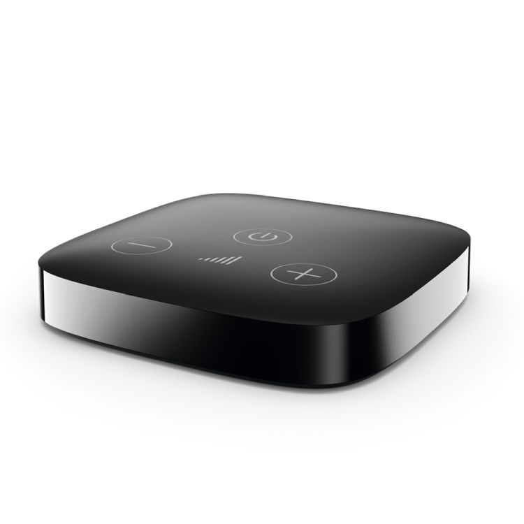 The TV Connector has a one-click connection button, is powered by micro USB and has a 3.5mm analogue and TOSLink digital audio input. Dimensions are 63mm x 63mm x 12mm.
